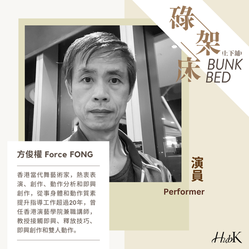 Noel去年初在香港編創一個舞台演出《懸念》,她與伴侶Force在錄像中一同起舞,作品成為她離開香港前夕的心情記錄;一年多後的今天,她再次創作一個由兩人演出的全新作品《碌架床(上下舖)》,這次她將移居台灣遇見的點滴事情,加上在文化和生活上既新鮮又似曾相識的矛盾感覺,也是呼應和記錄一個重要的人生階段。